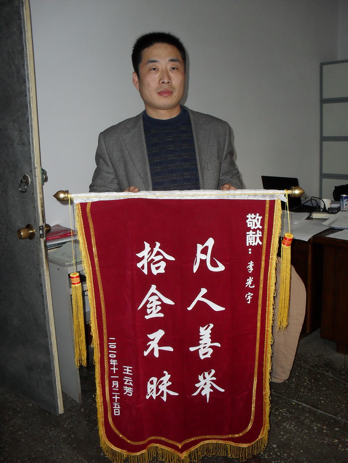 次日,為了再次對(duì)李光宇同志拾金不昧的事跡表示感謝,失主還千方百計(jì)的找到我公司的具體地址,并送上一面錦旗,我們對(duì)李光宇同志拾金 不昧的精神表示深深的敬意!